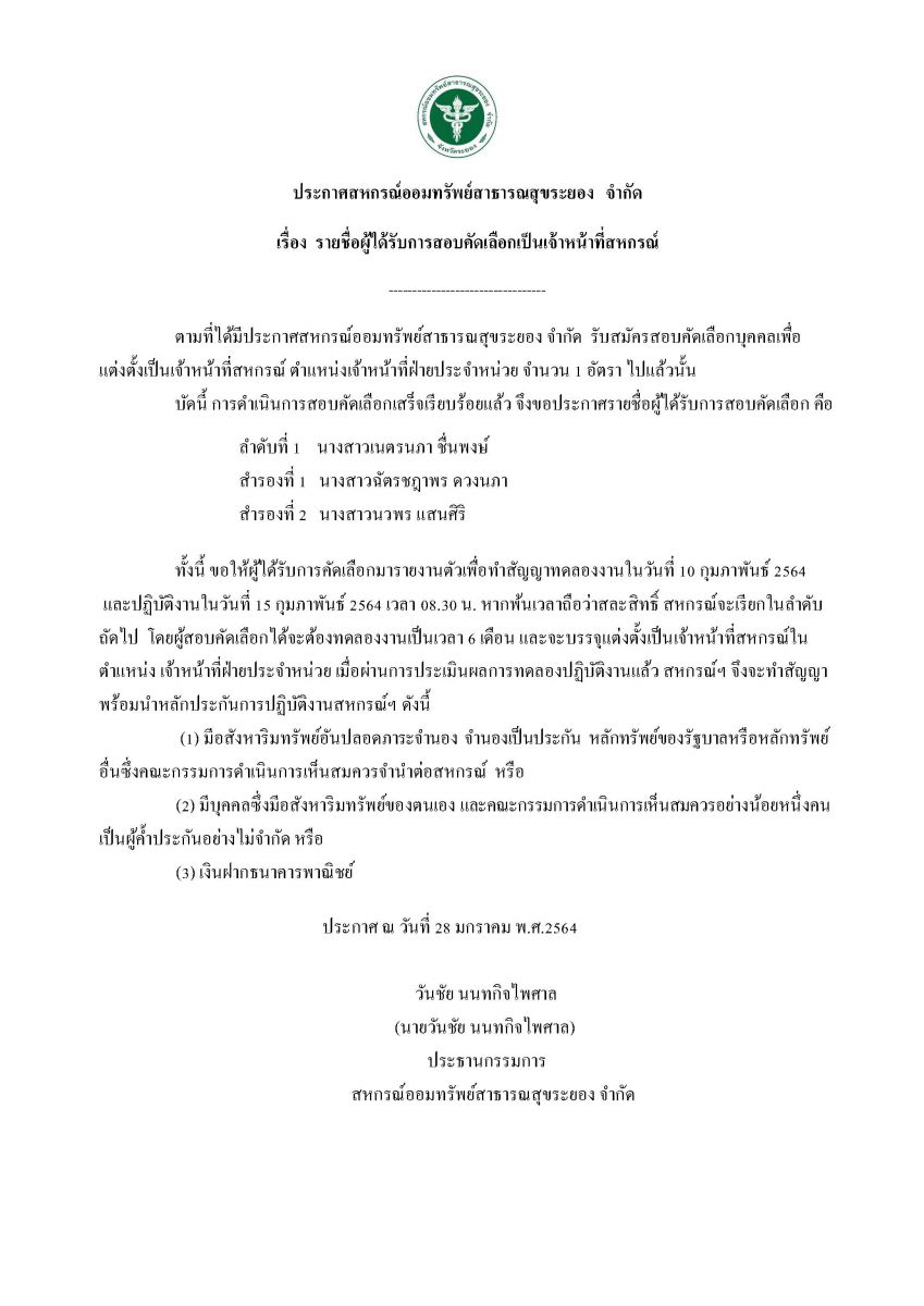 ประกาศรายชื่่อผู้ได้รับการสอบคัดเลือกเป็นเจ้าหน้าที่สหกรณ์