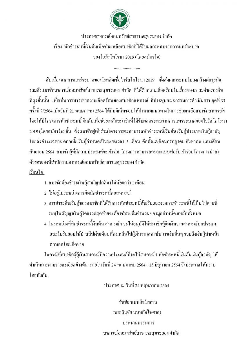 สหกรณ์ฯ จัดทำโครงการพักชำระหนี้เงินต้น